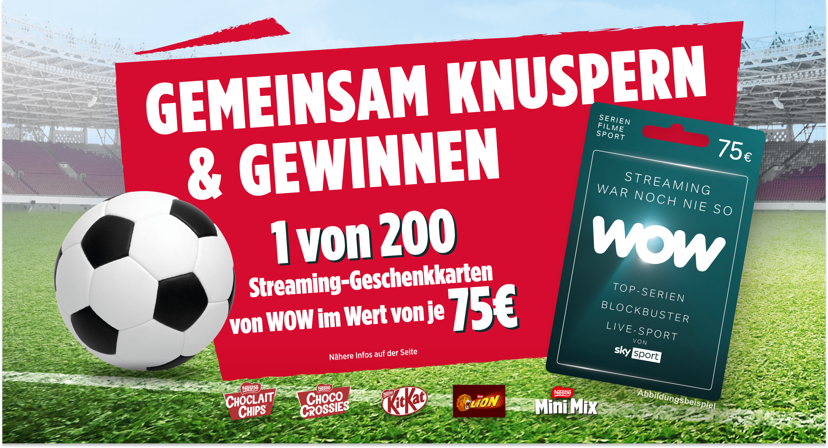 Das geht mit NESTLÉ CHOCO CROSSIES®, NESTLÉ CHOCLAIT CHIPS®, KitKat®, LION® und dem NESTLÉ® Mini Mix. Kauf einfach eines der Aktionsprodukte, mach mit bei unserer Verlosung und sichere dir die Chance auf 1 von 200 Streaming-Geschenkkarten von WOW im Wert von je 75 €. Jetzt gemeinsam knuspern, mitfiebern und gewinnen!